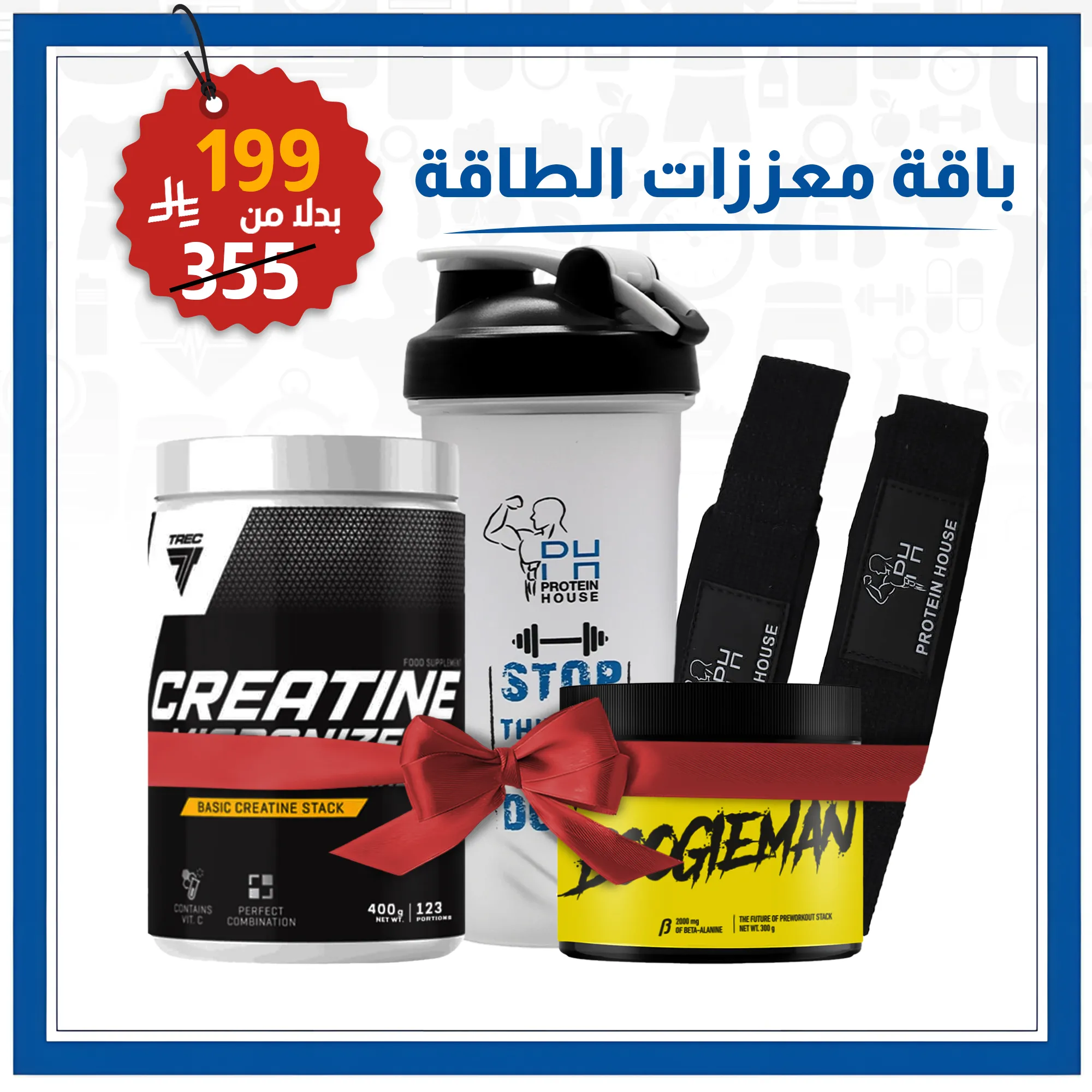 تجمع هذه الباقة بين محفز طاقة متكامل (Boogieman) وكرياتين مطور بامتصاص فائق مع رباط معصم رياضي لدعم الأداء في التمرين وشيكر احترافي لسهولة التحضير، لتجربة متكاملة قبل وأثناء التمرين.
