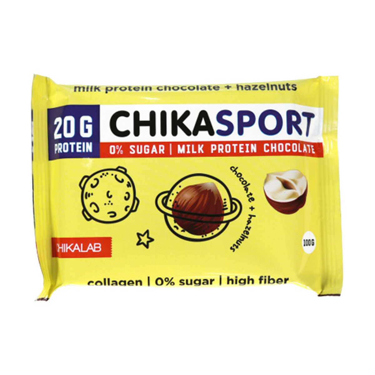 استمتع بلحظات لذيذة مع CHIKALAB CHIKA SPORT CHOCOLATE & HAZELNUTS 100 جرام. تقدم لك هذه الوجبة الخفيفة الرائعة تجربة طعام استثنائية تجمع بين رقائق الشوكولاتة اللذيذة وحبيبات البندق اللذيذة.